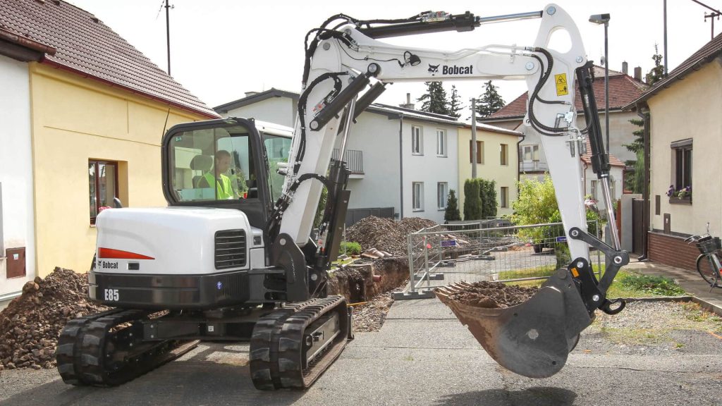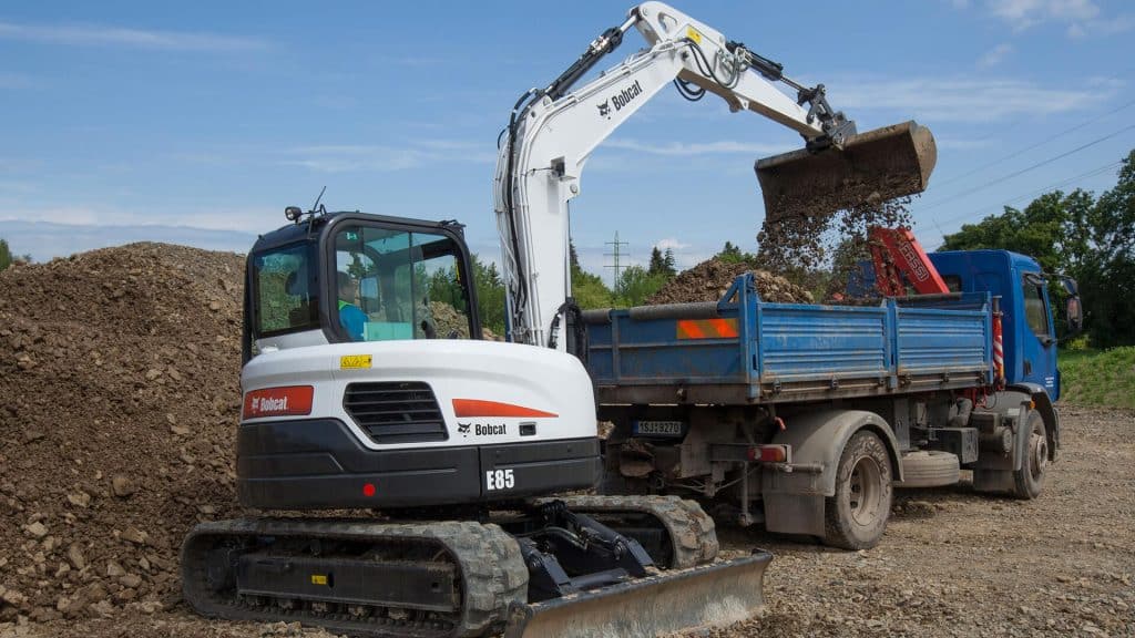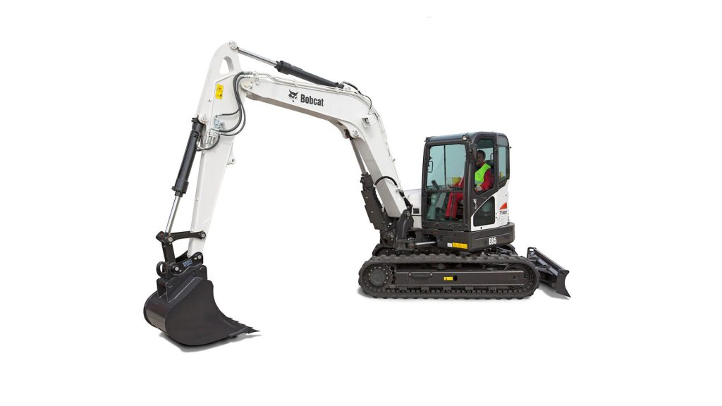 Som den största kompakta grävmaskinen i det nuvarande Bobcat®-utbudet, erbjuder E85 med minimalt överhäng kraftfull hydraulik och snabba cykeltider för att klara av de mest krävande jobben. Föraren har en rymlig hytt med ett fullt justerbart säte som standard. För att möta kundernas krav erbjuder denna modell också stålband som tillval, lång arm, ledad bom, lasthållningsventil för bladcylindern och tredje extrahydraulledningar.